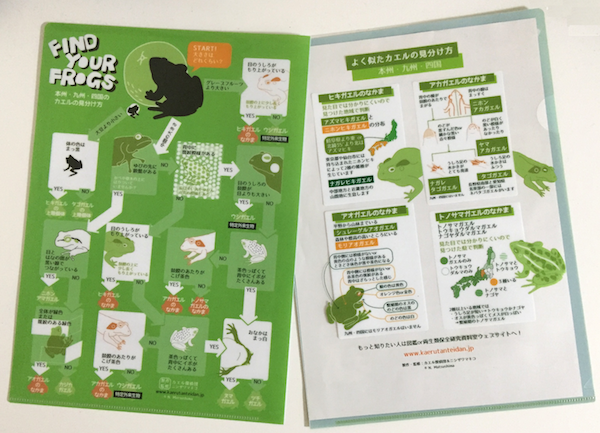 ウェブ版として公開されているカエル検索表をA4サイズのクリアファイルにしました。表面(右側)は似ているカエルの見分け方、裏面(左側)はチャート式の検索表になっています。(ファイルの間に白い紙をはさんで撮影しています)検索表とイラストは松島野枝団員です。